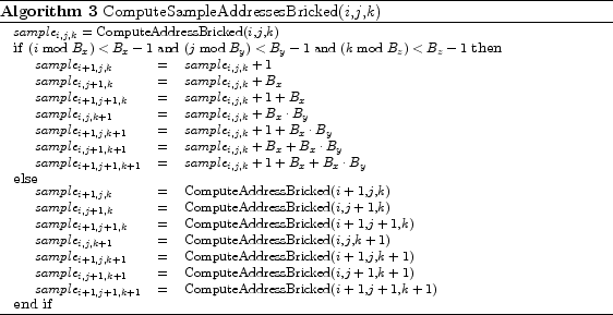 Using a bricked volume layout one will encounter this problem. The addressing of data in a bricked volume layout is more costly than in a linear volume layout. To address one data element, one has to address the block itself and the element within the block. The necessary address computation is given in Algorithm 2.