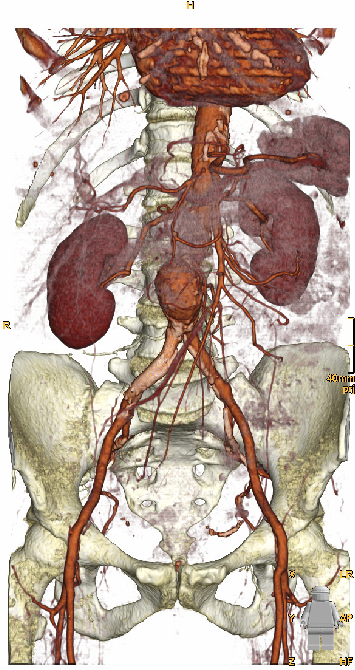 CT scan of abdomen. Through enhancement of the abdominal vascular structure an aorta aneurysma can be recognized.